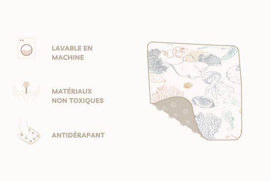 • Notre tapis de douche est fabriqué avec des matériaux sûrs et non toxiques, offrant à votre enfant un environnement sécurisé.